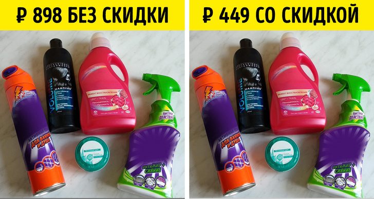 Актриса Хилари Суонк вырезает купоны из газет и обменивает их на скидки и бесплатные продукты в магазинах. Купоны у нас не так распространены, а вот всяческих акций («1 + 1 = 3», «2-й товар за ₽ 1», «скидка 50 % на 2-ю вещь» и так далее) полно. Отслеживать их можно на сайтах магазинов, в рекламных буклетах и социальных сетях.У меня закончился любимый крем, и, о чудо, в магазине на него была акция «2 = 1». Я скооперировалась с мамой. Ей тоже были нужны крем для лица, бытовая химия и шампунь. Большая корзина покупок досталась нам с 50%-й скидкой.