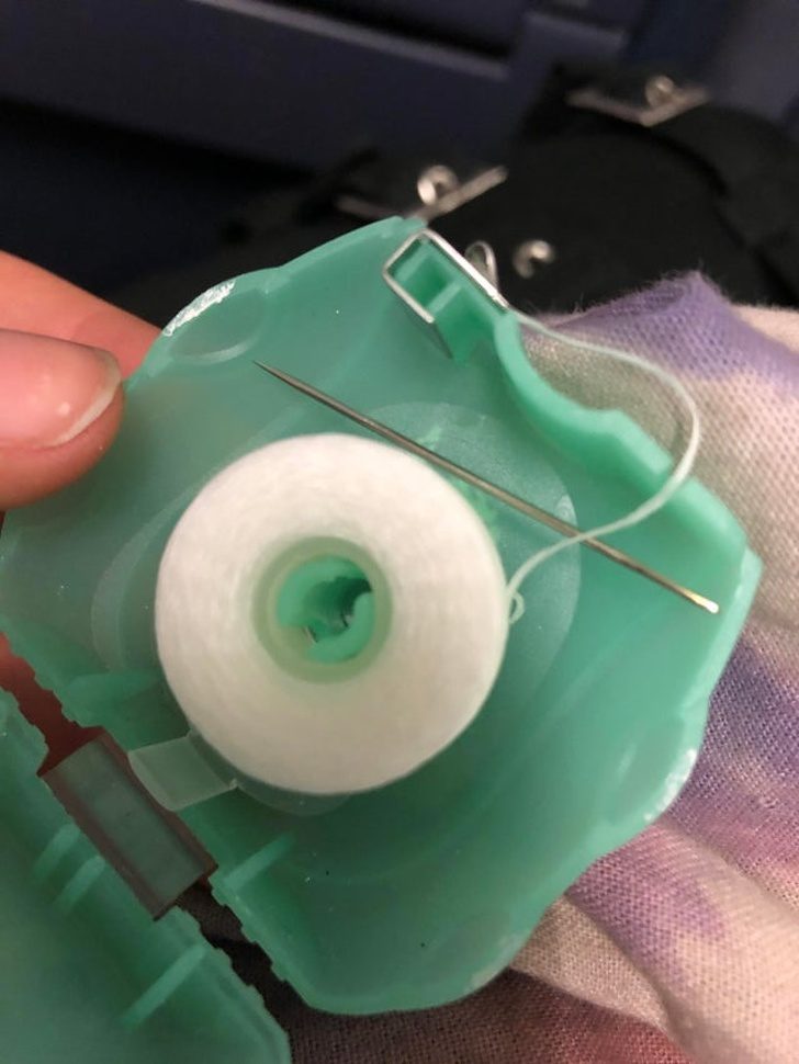 Зубная нить идеально подходит для шитья: дешево и прочно. Можно вставить иголку в контейнер, который также имеет небольшое лезвие для обрезки нити, и идеальный швейный набор, который можно взять с собой куда угодно, готов.