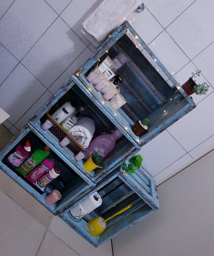 Используйте деревянные ящики, чтобы сделать оригинальные тумбы для ванной комнаты.