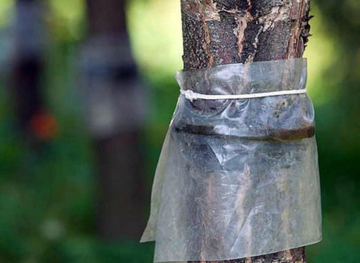 Липкий ловчий пояс делается немногим сложнее воронки. Используется он преимущественно против муравьев и тли. Для изготовления ловушки нужно будет разжиться составами «не засыхающего» клея. Данные составы ни в коем случае нельзя наносить непосредственно на растение. Сначала следует изготовить плотную, непроницаемую подложку. Она делается из мешковины, которая просто привязывается к стволу шнуром на высоте 20-30 см. Поверх нее крепится полиэтиленовая пленка. Важно, чтобы между краями защитного пояса и началом полиэтилена было расстояние не менее 5 см. Состав наносится на пленку. Помимо магазинных средств можно использовать и «народные». С задачей отлично справляется смола и деготь.