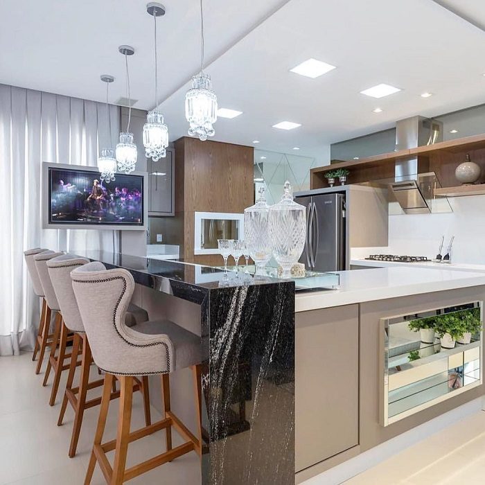 Г-образный остров с барной стойкой и столешницей