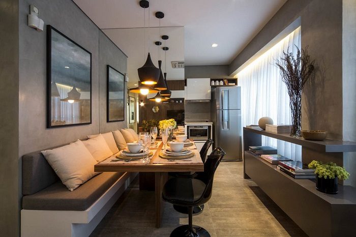 На кухне между комнатой и присоединенной лоджией, кухней и гостиной либо просто между гарнитуром и уголком для завтрака можно поставить тонкую, но весьма практичную перегородку из гипсокартона. Она позволит поставить второй ряд мебели (может, просто консольный столик, полочки) или повесить фото со стороны кухни и сделает ее более приватной. А со стороны столовой можно смонтировать зеркальную отделку или декоративные панели.
