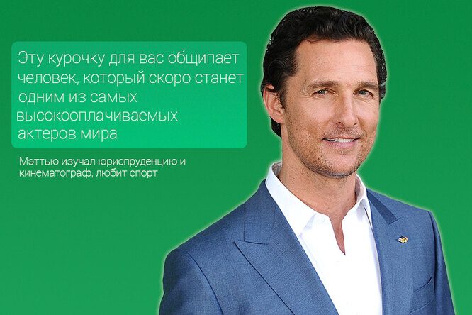 После окончания школы Мэттью Мак-Конахи на год уехал в Австралию искать себя. Чтобы заработать на жизнь, он брался за любую работу: ощипывал кур, собирал яйца, чистил клетки животных. К счастью, Мэттью быстро понял, чем хочет заниматься на протяжении всей жизни. Всё сложилось удачно: его вовремя заметили агенты и пригласили на кастинг.Джулия Робертс (мороженщица)
