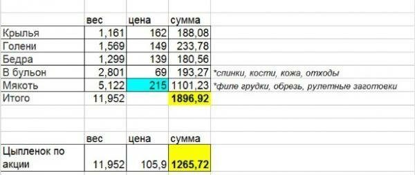 «По стоимости 76,90 руб. за кг. Я таких цен не видел уже несколько лет, 134р/кг, самое дешёвое, ну тухлятина в Магните по 120 была недавно.»А во-вторых, пусть девушке и удалось сэкономить в полтора, а то и в два раза, далеко не каждый готов разделывать курицу в таких количествах и готовить столько блюд сразу