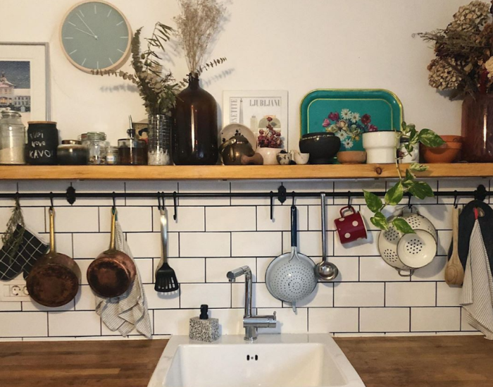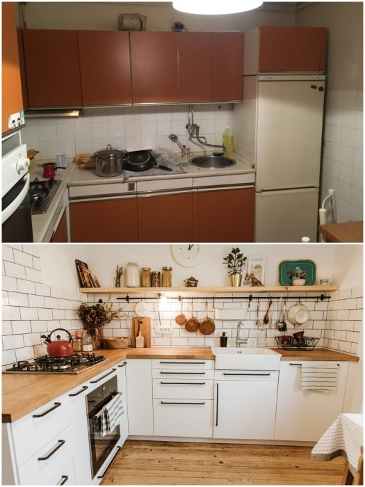 Для столешницы было выбрано специально обработанное натуральное дерево, от навесных шкафов отказались в пользу открытой полки для самой необходимой посуды и закрепили рейлинги, на которых наконец-то Нина смогла повесить приобретенные ранее медные ковшики и различные ложки-поварешки. Благодаря тому, что в квартире оказалась кладовка, все невостребованные предметы и техника просто перекочевали в шкафчики и полки, которые после реставрации там установили.