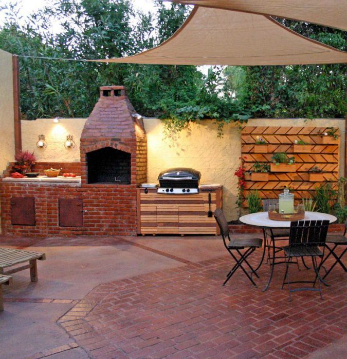 Лаконичная угловая кухня из кирпича с раковиной, хоспером, шкафчиком и несколькими полочками станет стильной и функциональной частью вашего летнего патио.