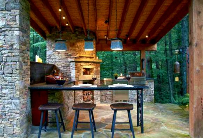 Большая каменная кухня с огромной печкой-камином, грилем и угловой барной стойкой, станет любимым местом для шумных посиделок в теплое время года.