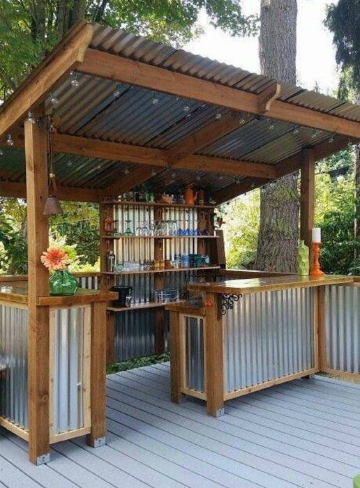 Практичная и достаточно стильная кухня в летнем стиле, которую можно смастерить из деревянных столбов и листов профнастила. Имея такую конструкцию на своем участке, вы получите возможность готовить на улице, не переживая о погодных катаклизмах.