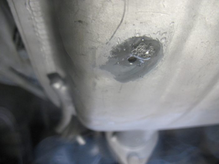 Первым делом следует организовать постоянный слив конденсата, образующегося во внутренней полости. Для этого достаточно проделать небольшое отверстие в «колбе» глушителя. Сделать его можно при помощи дрели и сверла по металлу. Дырочка позволит скапливающейся внутри жидкости вытекать наружу. Таким образом ржавчина начнет захватывать металл, из которого сделана важная деталь намного позже.