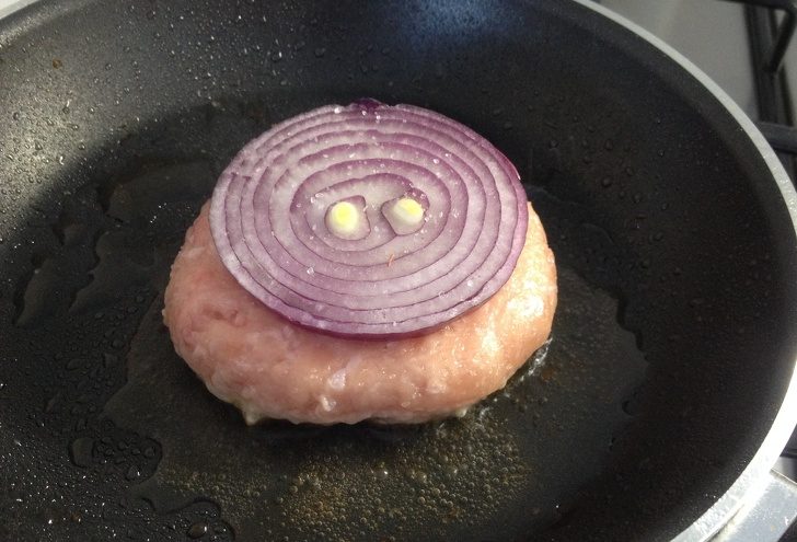 Как готовить: делаем из мяса котлетки определенной формы, как это делает Фрэнк, чтобы мясо равномерно прожарилось. Сначала поджариваем бекон без масла, убираем его и в эту же сковороду выкладываем котлетки плоской стороной вниз. Прямо перед выкладкой их нужно посолить. Не придавливая, обжариваем на сильном огне 3–4 минуты. Режем лук, накрываем им сверху котлету и чуть солим вот так: