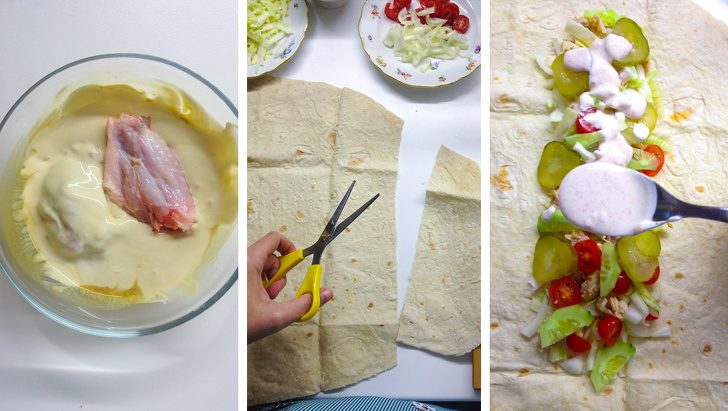 Как готовить: курицу я запекала на решетке в духовке в режиме «гриль». Овощи режем только перед заправкой шаурмы и чуть солим, чтобы они пустили сок и потом смогли пропитать мясо. У лаваша отрезаем края. Выкладываем на него начинку: сначала лук, затем мясо, еще чуть-чуть лука, следом капуста, огурцы, помидоры и сверху соус. Заматываем шаурму и на сковороде-гриль чуть поджариваем до хрустящей корочки.