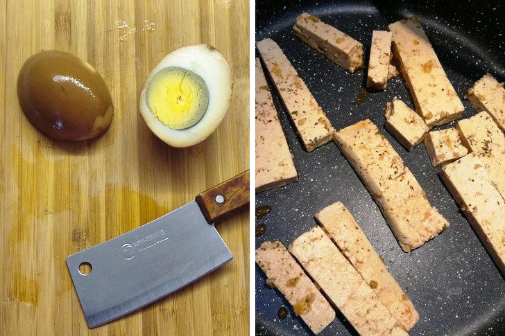 Подготовка: куриные яйца отвариваем и при желании маринуем — кладем в раствор из 1/3 рисового уксуса, 1/3 рисового вина и 1/3 соевого соуса. Убираем на ночь в холодильник. Я еще отдельно мариновала в соевом соусе тофу с черным перцем, потом его поджарила. Затем приступаем к шагу 2 — приготовлению самой лапши.