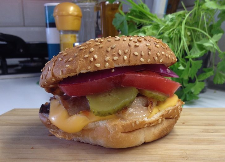 Бургер собираем как конструктор: на половинку булочки кладем котлету луком вниз, сверху на сыр укладываем 1–2 кусочка жареного бекона, ломтики соленого огурца и помидора, немного лука и накрываем другой половиной булочки. Готово!