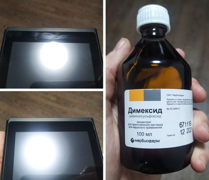 «Так уж вышло, что по собственной глупости испачкал экран Nintendo Switch секундным клеем. Что только не советовали: соду и соль, мыло, даже ацетон, который ототрет клей, но заодно растворит экран, который Nintendo по неизвестным причинам в 2017 году сделала пластиковым. Вычитал про чудо-средство „Димексид“. Что только он не растворяет, даже двигатели моют. Боялся, что растворит пластик экрана, но повезло и он идеально отмыл. Лучшего средства я просто не нашел, в своей аптеке я купил его за каких-то 50 рублей». © MrCrovley