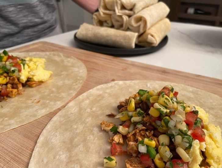 3 из них мы можем подать с отварным рисом или кус-кусом и свежим салатом. 3 — с теми овощами, что мы запекли на противне, добавив к ним кус-кус или киноа. Из оставшихся можно сделать буррито. Для этого потребуются: