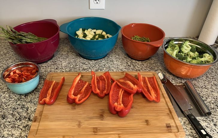 Первое, с чего стоит начать, — нарезать овощи. Дальше порядок действий такой:Разложим по контейнерам те из них, из которых потом будем собирать свежие салаты.