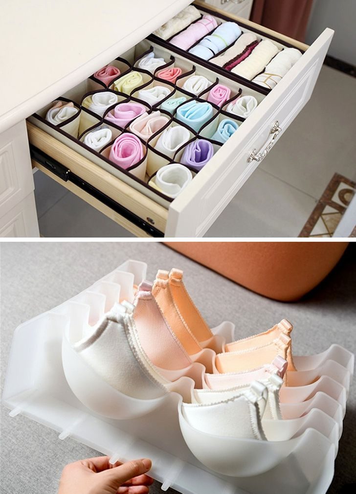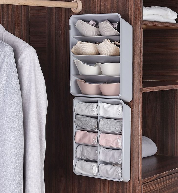 Начнем с нижнего белья. Его удобнее всего хранить в выдвижных ящиках комода или шкафа, в ячеистых тканевых коробках. Есть варианты для комплектов, есть отдельно для бюстгальтеров, есть настенные.