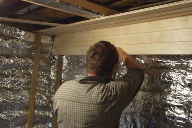 Простая комната, обшитая снаружи обрезками пенопласта, внутри обычной вагонкой и местами укрепленная фольгой.