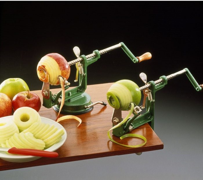 Визуально прибор напоминает мясорубку, родом из СССР, которая крепится к столу. Все, что нужно сделать – насадить яблоко на длинный винт, которые будет вращаться и лезвием срезать кожуру с фрукта. Если бы перед вами стояла задача – почистить огромное количество яблок, можно было бы задуматься о приобретение такого устройства. Однако вряд ли вам за раз приходилось чистить больше двух десятков, да и каждый день вы эту процедуру точно не осуществляете. Лучше вооружитесь обычной овощечисткой или обычным ножом – ничто так тонко и аккуратно не снимет кожуру с фруктов, как это сделаете вы.