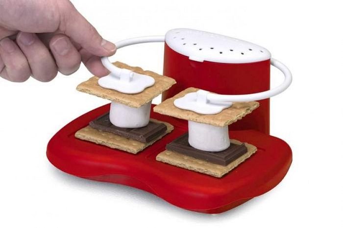 Сморы – это традиционное американское лакомство, которое готовится следующим образом: вам нужно купить крекеры, разломать их на половинки, положить на каждую небольшой кусочек шоколада и маршмеллоу, накрыть вторым крекером. После этого наливаете в смодержатель воду, кладете крекеры, зажимаете их специальными прессами и отправляете в микроволновку. Вуаля – через пару минут у вас получается мини-десерт с подтаявшим шоколадом. Вопрос: есть ли в этом смысл? Да, будет вкусно, но как-то слишком много телодвижений ради подобного результата.