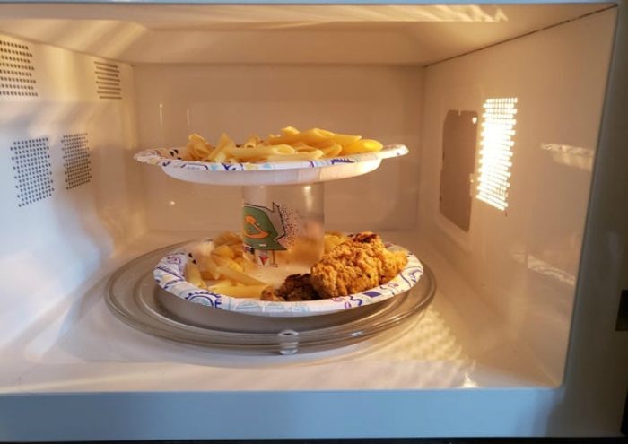 Утром, когда дорога каждая минута, редакция Novate.ru рекомендует не тратить время на подогрев блюд по отдельности. Вместо этого, разогревайте по два блюда сразу, поставив в центр нижней тарелки стакан, который как колона будет поддерживать верхнюю тарелку.