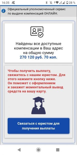 Чтобы получить обещанные деньги, нужно всего‑то оплатить услуги юриста или комиссию за перевод средств. Только никакую компенсацию вам не отправят — это развод. По сравнению с внушительными выплатами комиссия кажется ерундой — на этом и наживаются мошенники. Есть и варианты, где просят оставить данные банковской карты. Тут размер наживы ограничивается суммой, которая лежит на счёте у жертвы.