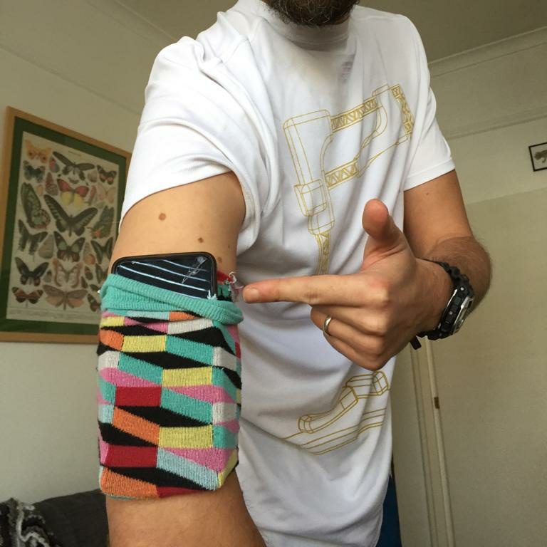 7. Если вы часто совершаете пробежки на улице и вам мешает смартфон в кармане, возьмите старый носок и сделайте из него наручную повязку для гаджета