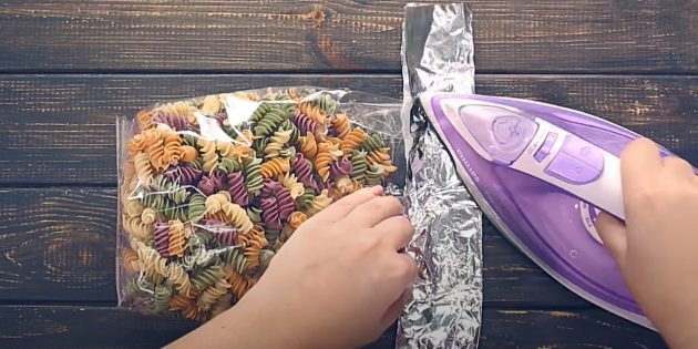 С помощью этого устройства удобно скреплять края полиэтиленовых пакетов, в которых хранится что‑то сыпучее. Но можно обойтись и без специального прибора. Просто возьмите два листа фольги, положите между ними край пакета и прогладьте утюгом.