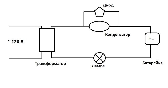 Сначала нужно подготовить все необходимое. Ключевая деталь будущей цепи – понижающий трансформатор с напряжением 2.4 Вольт. Такой можно или сделать самому, или купить (стоит немного). Далее нам понадобятся диод (желательно Д234Б), конденсатор с емкостью 10 мкФ, лампочка напряжения 3.5 В. Все перечисленное собирается в единую конструкцию по приведенной ниже схеме. В качестве корпуса можно использовать любой отработавший своей электроприбор. Для работы понадобится паяльник и флюс, клей, изолента.