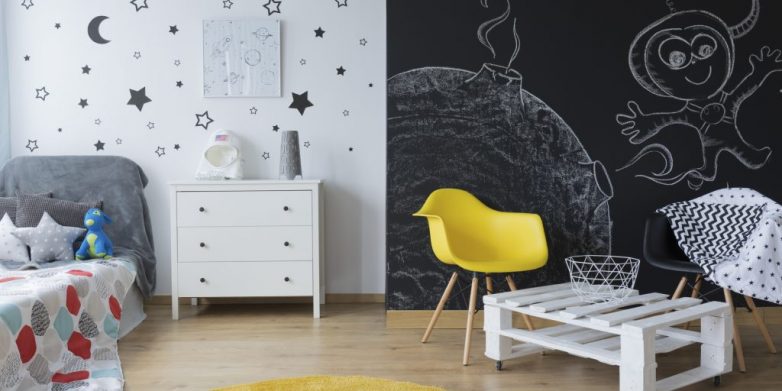 Не покупайте дорогие обои или краску для комнаты маленьких детей — стены обязательно разрисуют. Ограничьтесь водоэмульсионной или дешёвыми бумажными обоями. Если ребёнок уже способен понять, где рисовать можно, а где нельзя, покрасьте часть стены грифельной или маркерной краской.