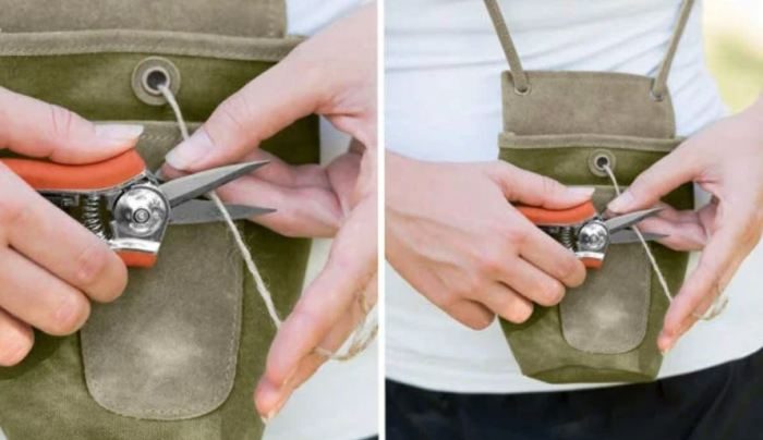 В дачном хозяйстве то и дело приходится использовать разные веревки, лески, провода и т.п. Все это имеет плохую привычку распутываться в самый неподходящий момент и запутываться в самой невероятной конфигурации! Чтобы ни того, ни другого больше не случалось, при работе с веревками рекомендуется использовать у себя на рабочем поясе специальный кармашек. Впрочем, его можно даже не покупать. Сделать такую штуку несложно из любой поясной сумки своими руками, если есть минимальные навыки портняжного дела.