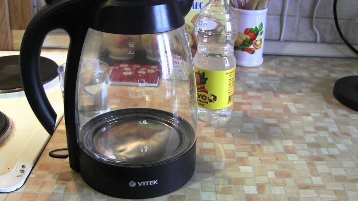 Уксус — очень действенное и агрессивное средство, которое стоит использовать только в самых тяжелых случаях загрязнений. Без опасения его можно применять для очищения стеклянных, пластмассовых и металлических чайников с толстым слоем застарелой накипи. А вот для электрических чайников выбирать уксус в качестве очистителя крайне не рекомендуется. Для того чтобы избавиться от налета на внутренних стенках чайника, следует использовать пропорции: половину литра воды и две трети стакана уксуса, либо заменить последний уксусной эссенцией в объеме 1-2 столовых ложек.