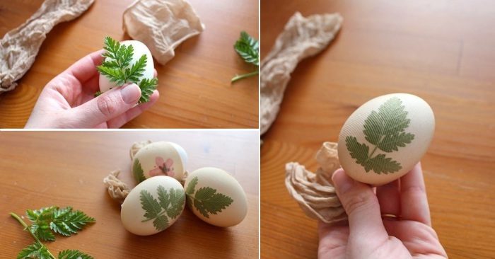С помощью капроновых колготок можно легко и просто сделать красивые рисунки на пасхальных яйцах. Для этого нужно приложить к яйцу листики выбранных растений, обтянуть его кусочком капроновых чулок, зафиксировать ткань, и опустить в краситель либо же сварить в луковой шелухе.