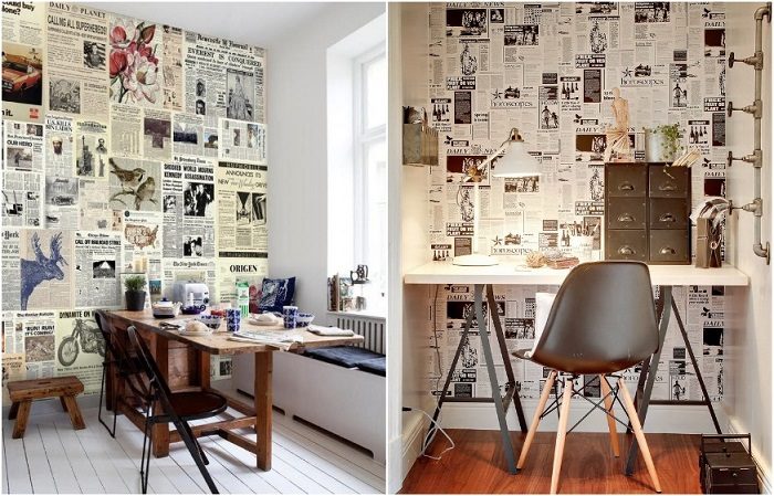 Мы предлагаем использовать газеты в качестве обоев. Да-да, вы не ослышались. Конечно, для начала их нужно привести в порядок, а после наклейки покрыть специальным лаком, но оно того стоит. Получается стильная акцентная стена. Лучше всего она будет смотреться на кухне или в кабинете в тандеме с винтажным элементом, например, столом или лампой.