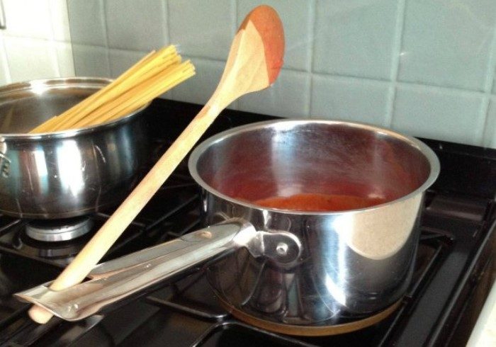 Еще одна загадочная дырочка на кухонном предмете и, снова-таки, удобная, чтобы повесить ковш, сковороду или сотейник на гвоздь. Однако придумали отверстие вовсе не для красоты. Во время приготовления блюд нужно часто перемешивать ингредиенты. Чтобы не думать, куда деть ложку или лопатку, вставьте ее в дырочку. Так и инструмент под рукой, и кухонную поверхность не запачкаете.