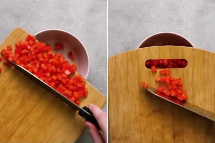 Неожиданно, но отверстие в разделочной доске предназначается вовсе не для того, чтобы вешать ее на гвоздь. И даже не для держания в процессе нарезки или перемещения продуктов. Через отверстие удобно ссыпать нарезанные продукты. Особенно в раскаленную сковороду или кипящую кастрюлю. Так вы минимизируете риск обжечься или получить ожог от брызгающего масла или кипятка.