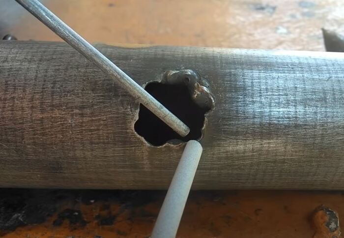 При заделывании отверстия при помощи сварки необходимо подкладывать очищенный электрод к краю поврежденного места так, чтобы получался зазор в несколько миллиметров. Таким образом, шов постепенно формируется именно за счет этого небольшого расстояния, куда будет течь и где будет застревать, а потом и затвердевать металл.