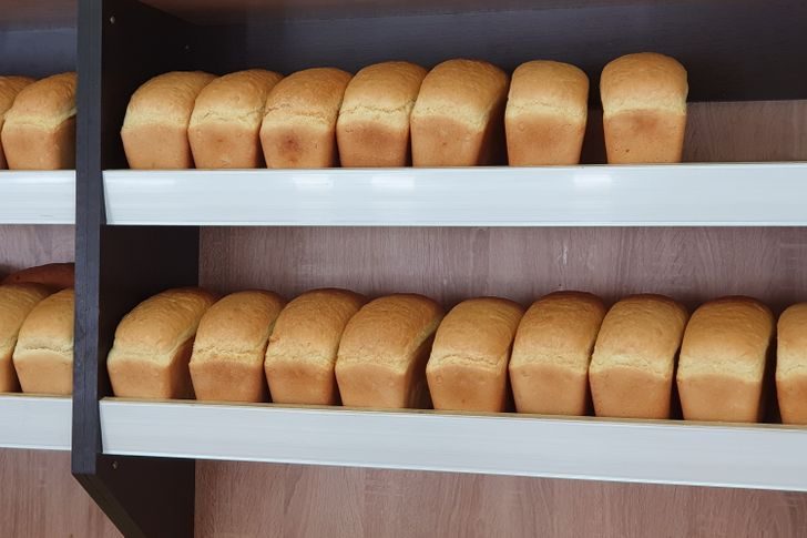 Выпечка лежит на полках или лотках с бортиками, предотвращающими падение хлеба. Причем сам ассортимент сбалансирован: есть все, но по чуть-чуть.
