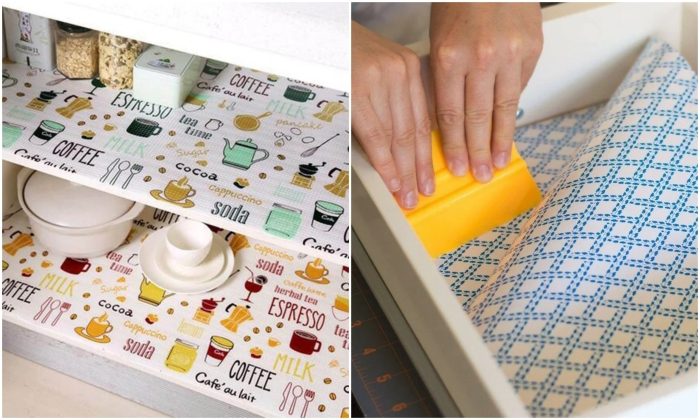 Не только внешний вид гарнитура может пострадать в период эксплуатации. Внутренние поверхности ящиков и полок тоже подвержены воздействию влаги и механическим повреждениям. Не стоит думать, что внутри никто не видит и будет как будет, ведь при открывании дверей и выдвижении ящиков вы каждый день будете созерцать потертости и облезлости. Чтобы избежать подобного дискомфорта и повреждений, сразу после монтажа гарнитура полки, дно ящиков и его стенки лучше оклеить пленкой или надежно зафиксировать любые другие водонепроницаемые подстилочные материалы или специальные коврики, которые легко приобрести в магазинах. Они помогут уберечь мебель от потертостей, капелек жидкости, сыпучих продуктов или крошек, которые со временем просыпаются внутрь шкафчиков и ящиков.