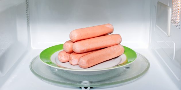 Снимите с сосисок искусственную оболочку и выложите их в ёмкость для микроволновки. Охлаждённые готовьте на полной мощности 1–1,5 минуты, замороженные — 3–4 минуты.