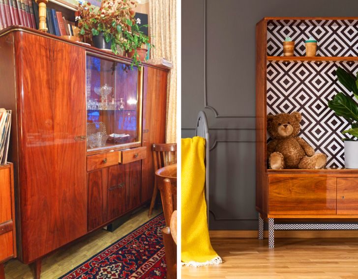 Классика советских квартир — огромный сервант в центре комнаты. Для того, чтобы он смотрелся свежо и интересно, покройте его, например, матовой краской либо же обклейте заднюю стенку яркой липкой лентой или цветными обоями. Таким образом в интерьере появится красочное стильное пятно.