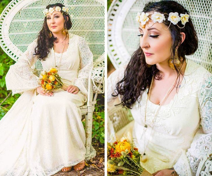 «Это платье на 80 % состоит из окрашенного постельного белья, а обруч под юбку сделан из ПВХ-труб. Я надела его, когда делала предложение своему мужу-фотографу»