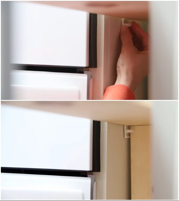 Советы от Изабель: Чтобы предотвратить полное выдвижение выкатной полки, лучше установить стопперы. Для этих целей используют пластиковые крючки с тупым кончиком, которые закрепляют на вертикальной поверхности шкафа и такой же элемент наклеивают на стенку холодильника. Вот они и остановят загруженную банками, бутылками и различными девайсами созданную полку.