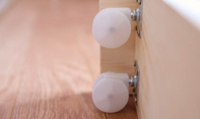Для начала на полке, которая будет располагаться внизу, нужно закрепить колесики. Это очень ответственный момент, от которого будет зависеть удобство пользования и срок службы самой полки. Их следует располагать ближе к боковому краю полки при этом следить, чтобы движению во все стороны ничего не мешало. Колесики к доске можно прикрепить саморезами. Когда все будет закреплено, нижняя полка прикручивается так, чтобы колесики выступали на 0,5 — 0,6 см из-под фасадной и задней планки, которые служат каркасом. После этого можно устанавливать оставшиеся полки, используя саморезы.