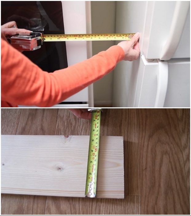 У кого такая же проблема, тот сможет без особых проблем повторить нехитрые действия, которые выполняла Изабель, избегая ее ошибок и прислушиваясь к советам. Для того чтобы выкатная полка прослужила долго и была надежной помощницей, нужно приобрести качественные материалы, в данном случае доски, крепежные элементы, колесики и краску, которая подходит по цвету вашего гарнитура. Проанализировав, какой высоты будете делать полку, следует тщательно измерить ширину пролета, причем делается это в нескольких местах и на разных уровнях.
