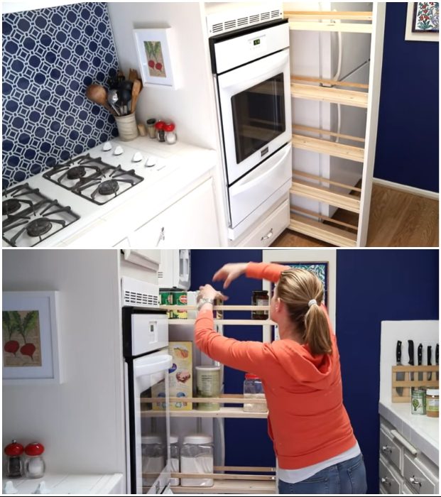 Не всегда при обустройстве кухни удается разместить мебель и оборудование так, чтобы не оставалось пролета. Особенно это актуально в случае с холодильником и крупногабаритной мебелью/стеной. Как ни крути, а узенькое пространство все равно остается, тем более что к холодильнику плотно придвигать ничего и нельзя. Но когда кухня совсем крошечная, а всяких баночек, коробочек, вазочек и разной мелочевки просто некуда девать, то руки чешутся, чтобы задействовать даже такое узкое пространство.