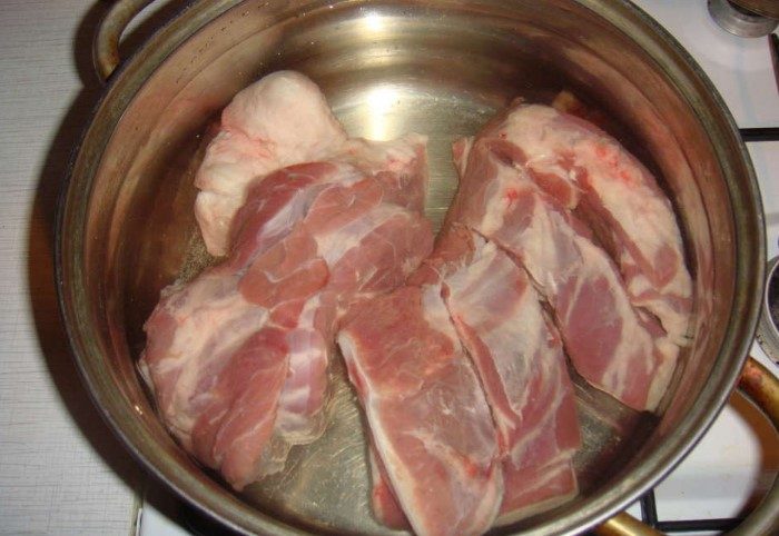 Хороший вариант для любителей отварной свинины. Залейте продукт водой, поставьте на плиту и доведите до кипения 3-4 раза. После каждого температурного максимума сливайте жидкость, наполняйте кастрюлю новой и прокипячивайте мясо.