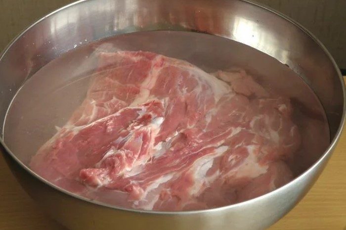 Промойте свинину и нарежьте ее на мелкие куски, чтобы ускорить процесс. Налейте в миску охлажденную воду, подсолите, добавьте по 5 ст.л. уксуса 9% на каждый литр жидкости и окуните продукт. Вымачивайте мясо в течение суток, заменяя раствор на новый каждые 5-6 часов. Крупную часть туши придется держать в жидкости дольше.
