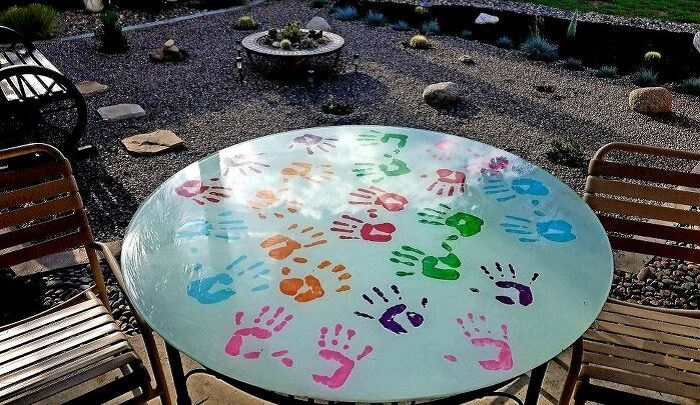 А стол и вовсе является особенным, ведь в один из праздников Матери, когда уже взрослые дети спросили, что она хочет в подарок, креативная мама пожелала иметь отпечатки рук всех своих домочадцев. Тиффани к заветному дню приобрела стеклянный стол, разноцветные краски и лак. Когда вся семья была в сборе, она покрасила им ладошки и все с радостью оставили на его стеклянной поверхности отпечатки (внутренней части). В этом умилительном действе участвовали она с мужем и дети, и их вторые половинки. Когда разноцветные автографы были собраны, после высыхания краски мастерица из баллончика покрыла их белой эмалью и лаком, чтобы непогода не испортила дорогой сердцу шедевр.