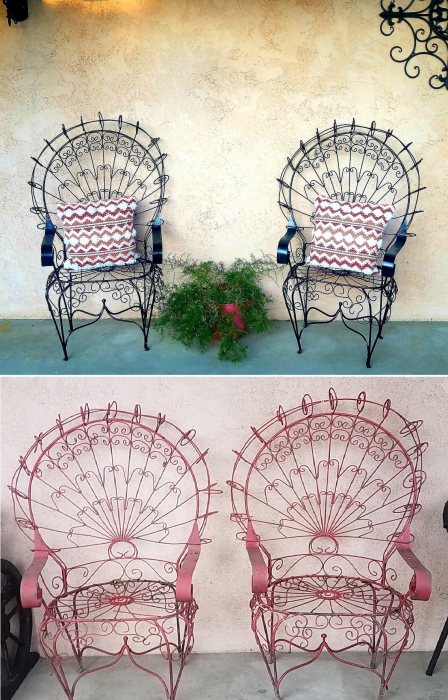 Такое преображение пришлось по душе владельцам дома, поэтому неугомонная женщина решила сделать еще и зону отдыха на заднем дворе, а также немного расширить композицию. Несколько выходных, минимум усилий и старая лавка, а также изящные кованые стулья стали главными героями подворья. Как призналась сама хозяйка, она любит мастерить и преобразовывать, причем делает это все из подручных материалов или приобретенных за сущие копейки в комиссионных магазинах интересных предметов. Именно таким образом и появились во дворе огромная тарелка, которую пристроили на ножки, стеклянные бусины в виде булыжников, ну а садовые стулья с радостью отдала подруга.